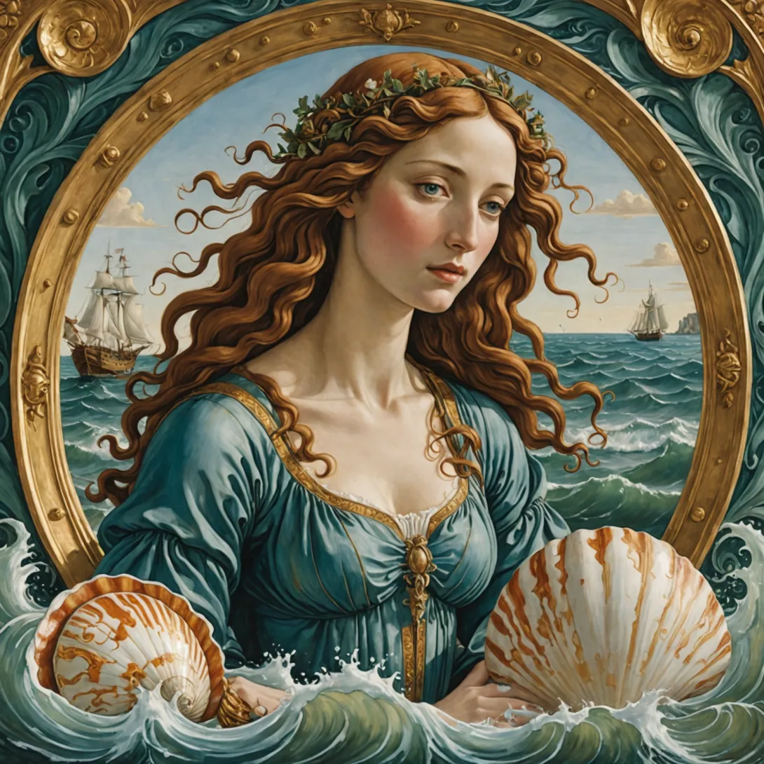 - «Рождение Венеры» — изображает мифологическую богиню Венеру, выходящую из моря на раковине, символизируя красоту и любовь.